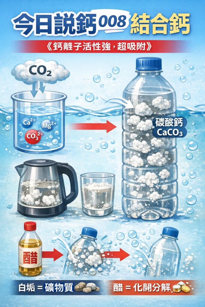 當鈣離子被解離於水裡後,如果水本身就有礦物質,像是鎂、鈣、碳酸鹽,混在一起,就很容易「重新結合」,變成不太溶的白色物質。就像水壺用久了會有白垢⋯那不是髒,是礦物群被黏在瓶子上。