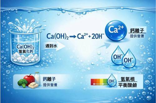 在牡蠣殼鈣當中,除了碳酸鈣、氧化鈣,還存有氫氧化鈣;例如:它的化學式是:Ca(OH)₂;當它遇到水時,會發生「解離」:Ca(OH)₂ → Ca²⁺ + 2OH⁻;意思是:一個氫氧化鈣變成一個鈣離子(Ca²⁺)及兩個氫氧根(OH⁻)。這個氫氧根,就是讓水變成鹼性的關鍵;鈣離子負責營養,氫氧根負責平衡酸鹼。