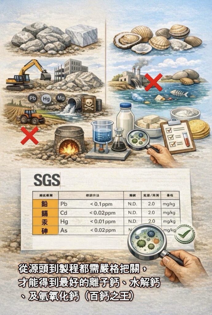 「鈣」能不能入口,源頭很重要。例如重質碳酸鈣的大理石、石灰石會帶有重金屬或不明雜質,輕質碳酸鈣如貝殼,若受污染也不好。製程溫度控制及純化技術,也跟食安風險相關;所以從源頭到製程都需嚴格把關,才能得到最好的離子鈣、水解鈣、氧化鈣、及氫氧化鈣。