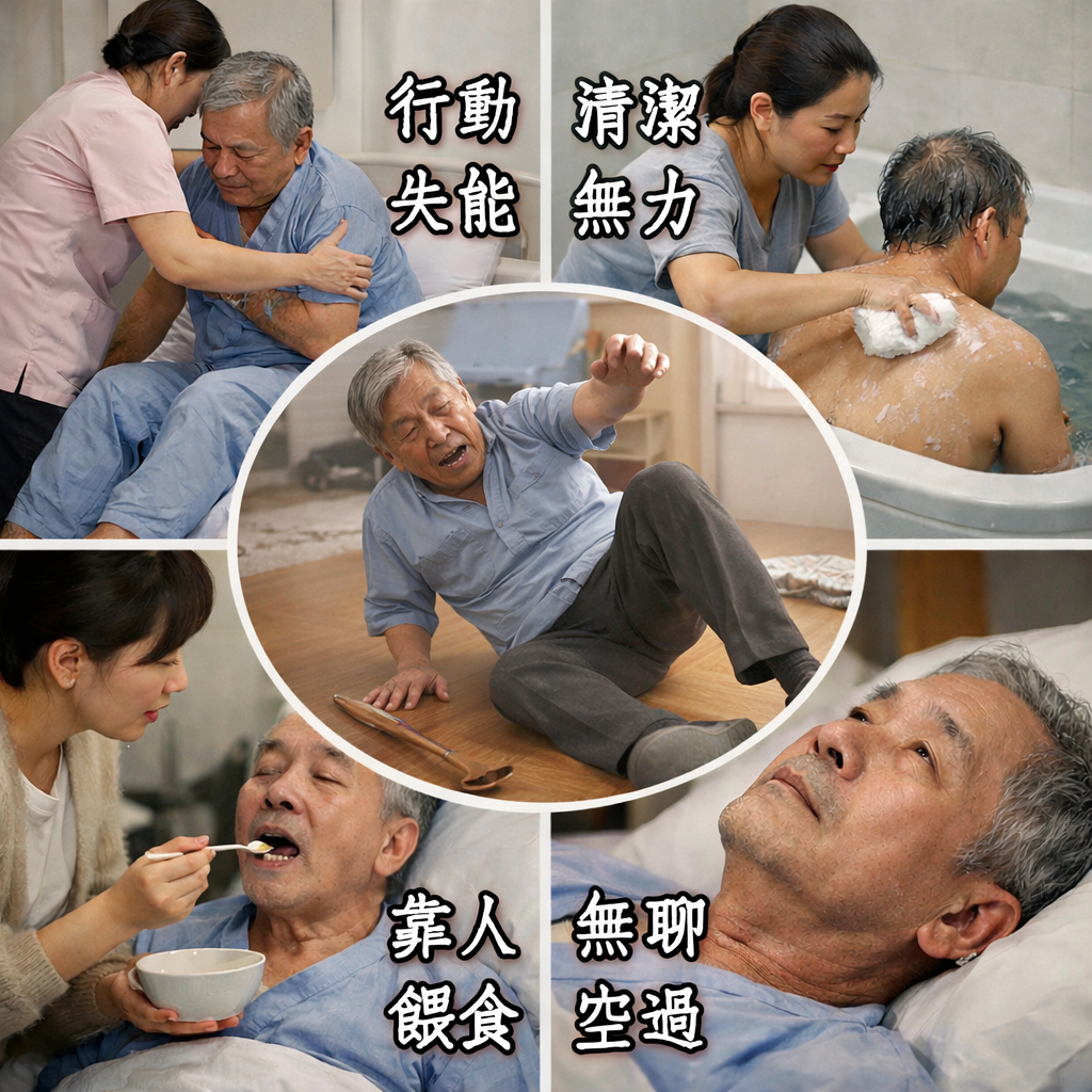 很多時候不是什麼大意外,而是地滑、沒站穩、腳一軟,就倒下去。從原本能走能動,變成躺在床上,吃飯、翻身、洗澡、上廁所都要人幫。最難受的,不只是痛,而是看著自己一天天無力,尊嚴慢慢流失,心裡那種「拖累家人」的苦,說不出口。