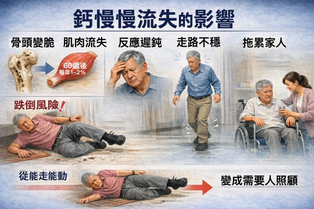 很多人以為老了不舒服是正常,其實很多都跟鈣慢慢流失有關。除了骨頭變脆,肌肉也會流失、力量變弱,神經反應變慢,走路不穩,跌倒風險大大增加。一次跌倒,可能就改變一輩子,從能走能動,變成需要人照顧。