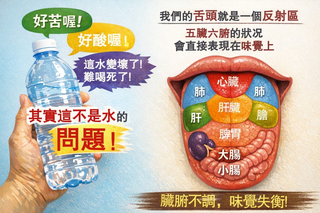 這一瓶水,有些人覺得苦、覺得酸,甚至怪說水怎麼變壞了,難喝死了。其實這不是水的問題,我們的舌頭就是一個反射區,五臟六腑的狀況,會直接表現在味覺上。喝起來會苦,火氣大有口臭,通常跟肝臟異常有關;若喝起來偏酸,有可能心臟在提醒你的心血管是否該注意了。