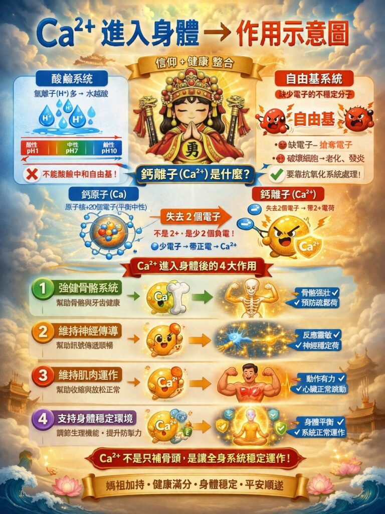 很多慢性病其實都跟身體「酸鹼失衡」有關,像是體循環慢、神經反應差、肌肉無力。但是鈣離子不是要治病,而是撐住身體的基本功能。像神經傳導需要鈣、肌肉收縮需要鈣、心臟跳動也需要鈣,當這些功能比較穩,人就不容易一直覺得虛、累、沒力。