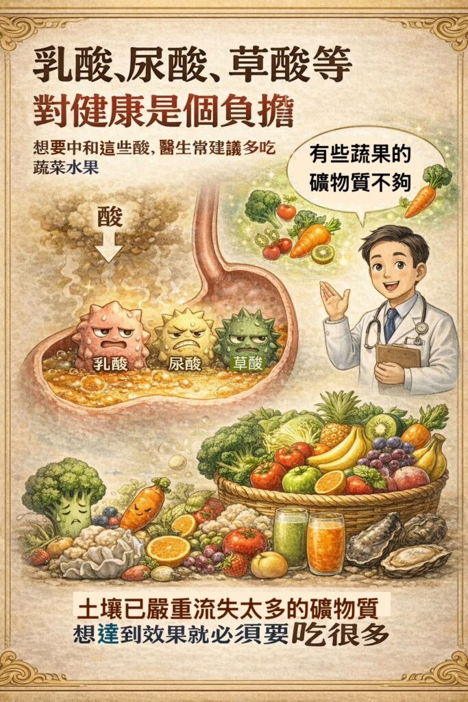 因為每天都會累積酸性代謝物,如乳酸、尿酸、草酸等,對健康是個負擔。想要中和這些酸,醫生常建議多吃蔬菜水果,但其實它們的鹼性含量有限,想達到效果就必須要吃很多。