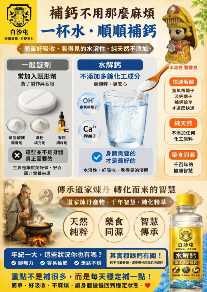 一般錠劑為了成型,常會加入硬脂酸鎂、澱粉、香料等賦形劑,主要是方便製作與吞服,但這些並不是身體真正需要的。相較之下,水解鈣走的是更單純的路線,不添加多餘化工成分,延續千百年藥食同源的概念,有如道家煉丹轉化而來的智慧。