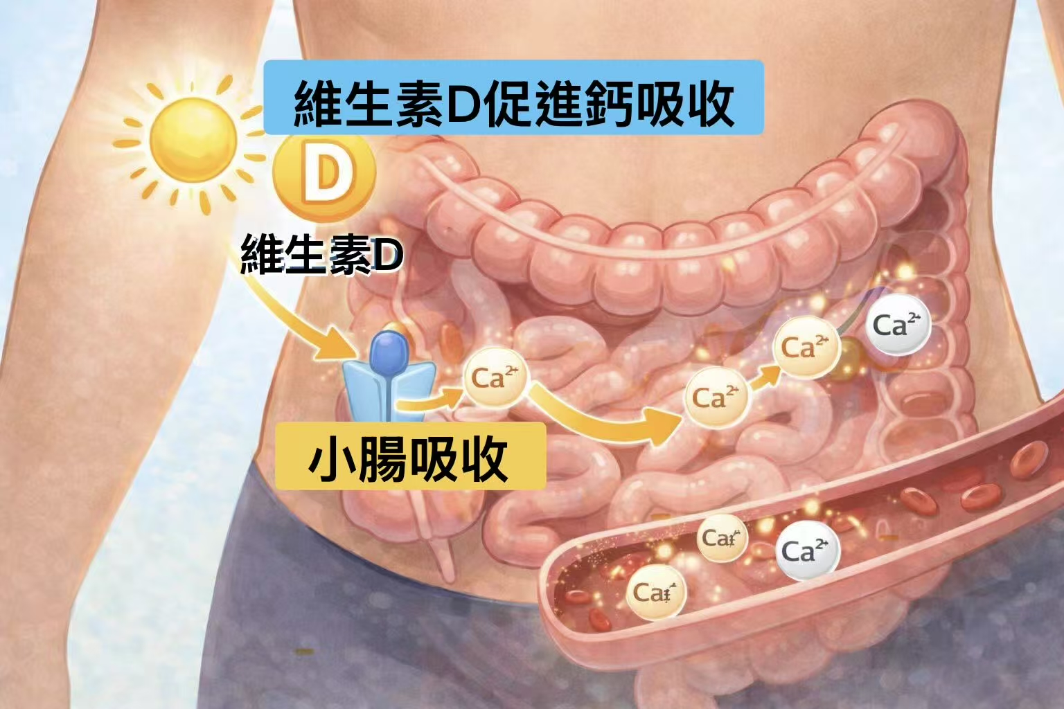 鈣主要於小腸吸收,並透過維生素D調節吸收效率。人體藉由副甲狀腺素與降鈣素維持血鈣穩定,形成精密的鈣平衡系統。
