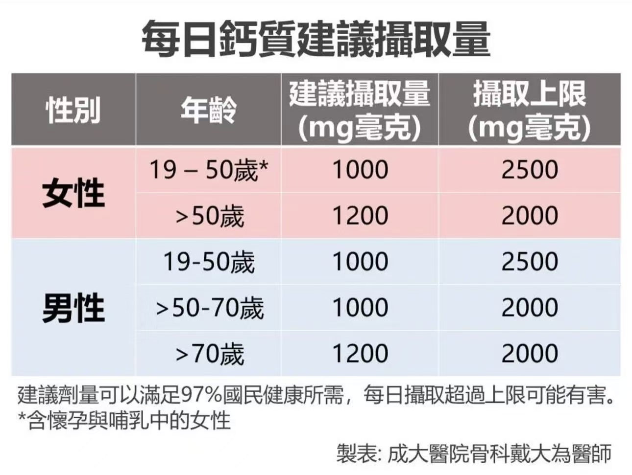 成人每日建議攝取約1000mg鈣質,青少年約1200mg。建議分次補充並搭配維生素D,以提高吸收效率並降低負擔。