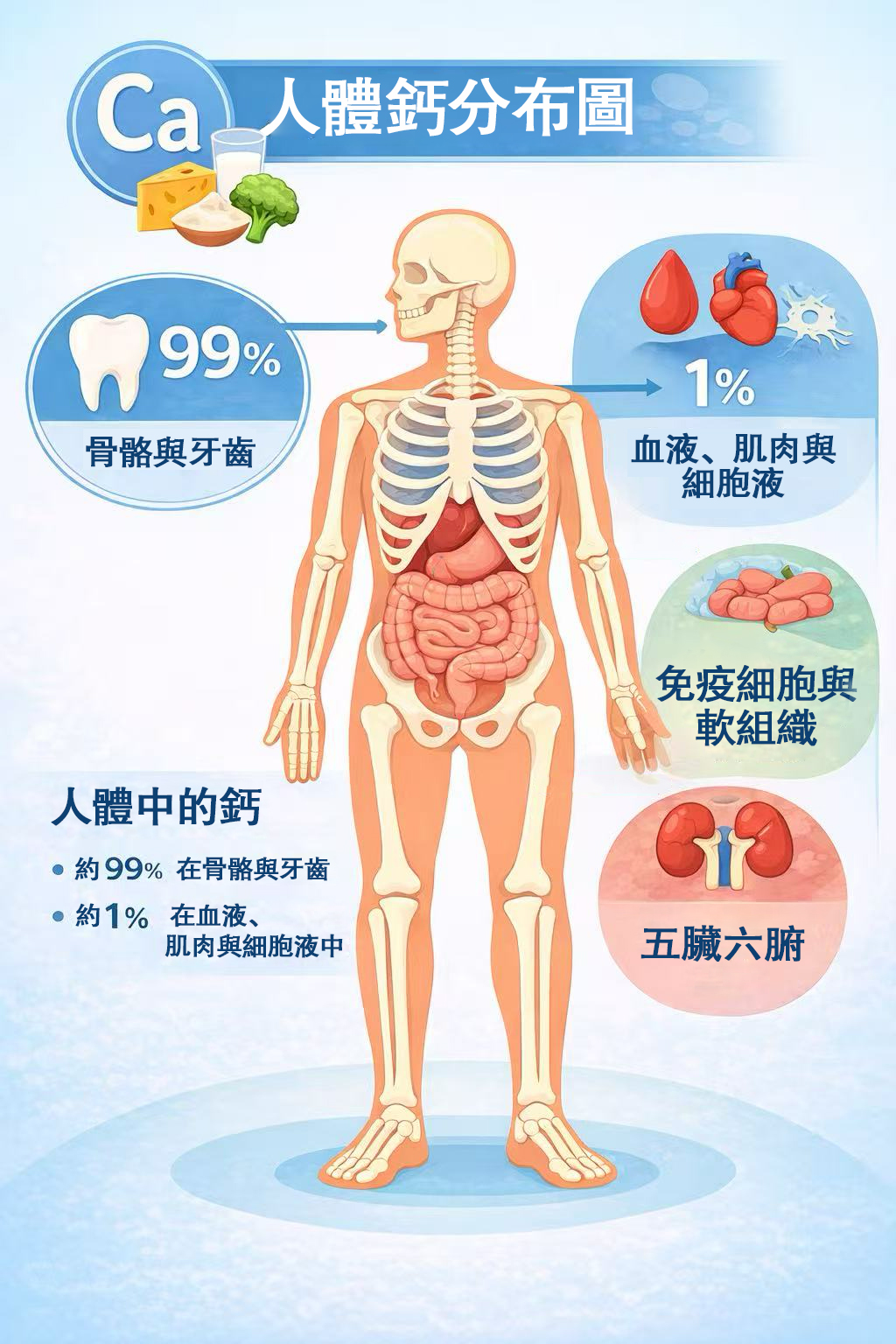 人體約99%的鈣儲存在骨骼與牙齒中,以結構形式存在;另有約1%存在於血液與細胞中,為「功能性鈣」,直接參與生理反應。