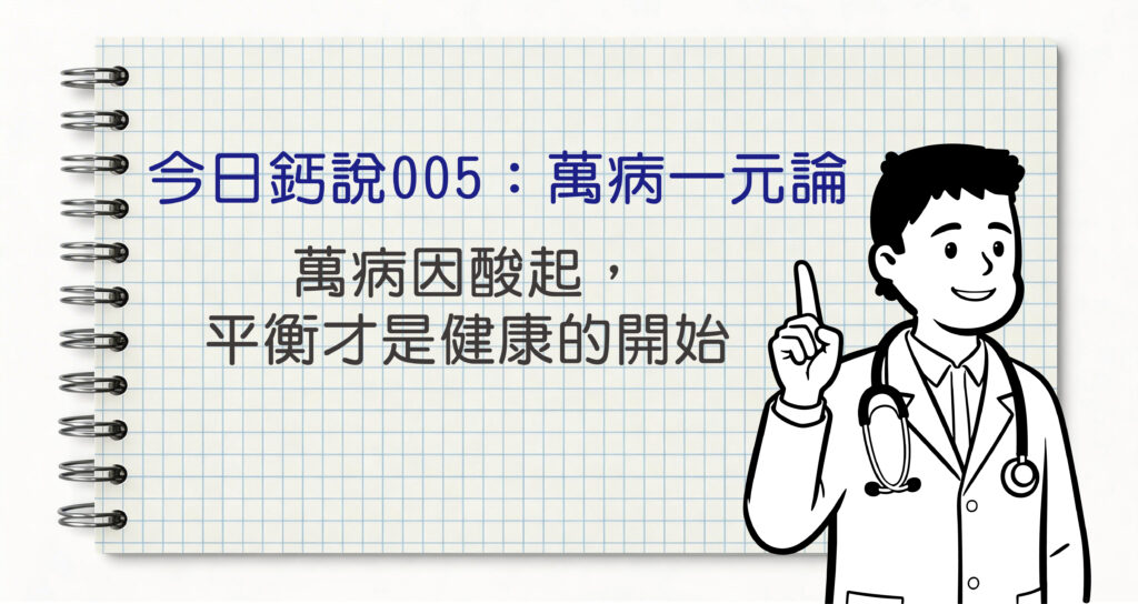 今日說鈣005: 萬病一元論 今日鈣說 / Bstion 「萬病一元論」由日本自然療法學派提出。該醫學界認為,許多疾病表面不同,但根本原因可能相同,就是人體長期處於偏酸 今日說鈣005: 萬病一元論 閱讀全文 »